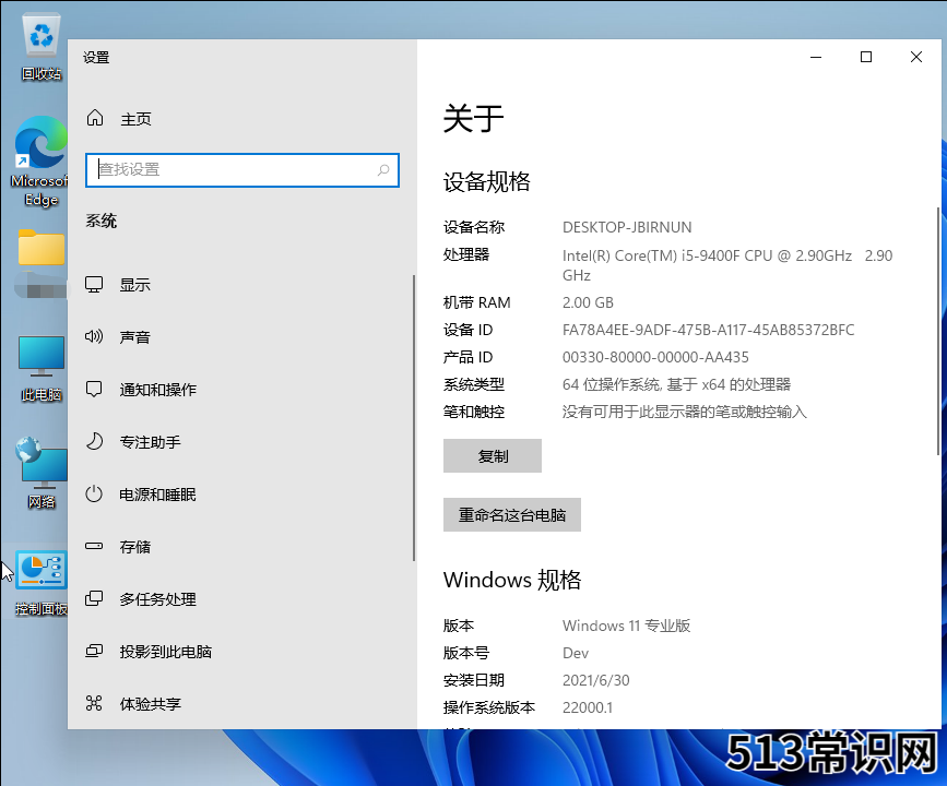 2、在打开的属性中,我们就可以直观的查看到处理器(CPU)、内存等部分核心硬件信息。另外我们还需要查看显卡,因此还需要点击左侧的“设备管理器”(小编这是在虚拟机运行的)
