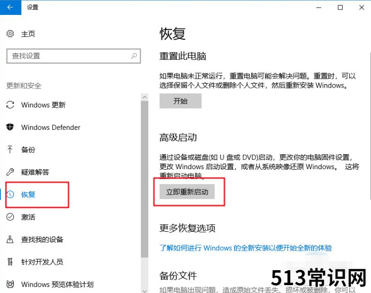 2、点击切换至【恢复】选项卡,点击【立即重新启动】