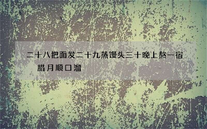 二十三,糖瓜粘,二十四,扫房子,二十五,做豆腐,二十六,炖猪肉,二十七,宰年鸡,二十八,把面发,二十九,蒸馒头,三十晚上熬一宿,大年初一扭一扭,除夕的饺子年年有。 忙年歌,为流行于中国北方地区的传统民间儿童歌谣。又称其为过年谣。忙年歌利用童谣的方式,将各个地区的春节民风民俗都体现了出来。